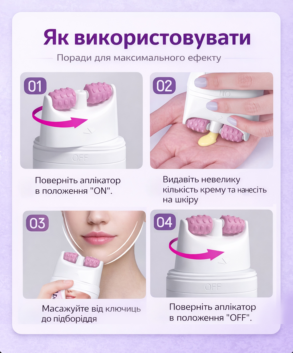 Результат приємно здивував. Після регулярного використання шкіра стала більш гладкою та підтягнутою. Зручно наносити, ролики роблять легкий масаж. Хороший варіант для домашнього догляду.